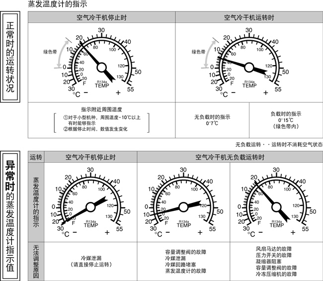 冷干機運轉(zhuǎn)時、請確認(rèn)蒸發(fā)溫度計的表示是否在綠色帶范圍內(nèi)。