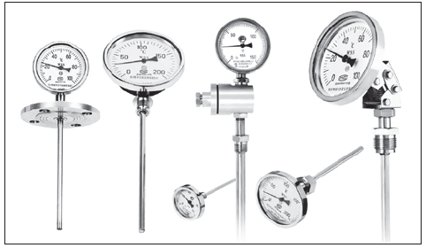 測量氣體和液體的溫度。與玻璃溫度計相比,它具有無汞損壞、讀數(shù)清晰、堅固耐用的優(yōu)點。我生產(chǎn)多用途雙金屬溫度計,規(guī)格品種齊全,質(zhì)量穩(wěn)定可靠,可廣泛應(yīng)用于工業(yè)、農(nóng)業(yè)、國防和科研領(lǐng)域的各個部門。雙金屬溫度計結(jié)構(gòu)特點和工作原理雙金屬 溫度計(以下簡稱溫度計)使用螺旋加熱器雙金屬板作為溫度傳感元件,并將其安裝在保護(hù)套中,一端固定(固定端),另一端(自由端)連接到薄軸上,軸端帶有指針。當(dāng)溫度變化時,溫度傳感元件的自由端立即旋轉(zhuǎn),并通過細(xì)軸驅(qū)動指針以指示刻度盤上的溫度變化。直行溫度計通過轉(zhuǎn)向傳動機(jī)構(gòu)驅(qū)動指針。外殼材料包括鋼板、鑄造鋁合金和不銹鋼板??烧{(diào)角度溫度計的頭部可借助波紋管、轉(zhuǎn)角機(jī)構(gòu)和其他部件從角度調(diào)整為直線或從直線調(diào)整為角度。